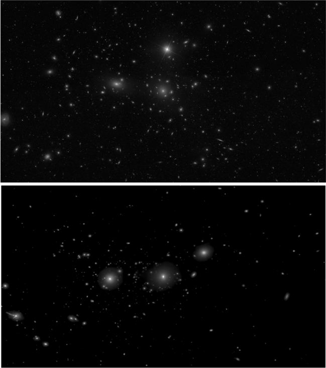 真實(shí)的后發(fā)星系團(tuán)(上圖)和模擬的后發(fā)星系團(tuán)(下圖)在可見(jiàn)光波段圖像的比較。